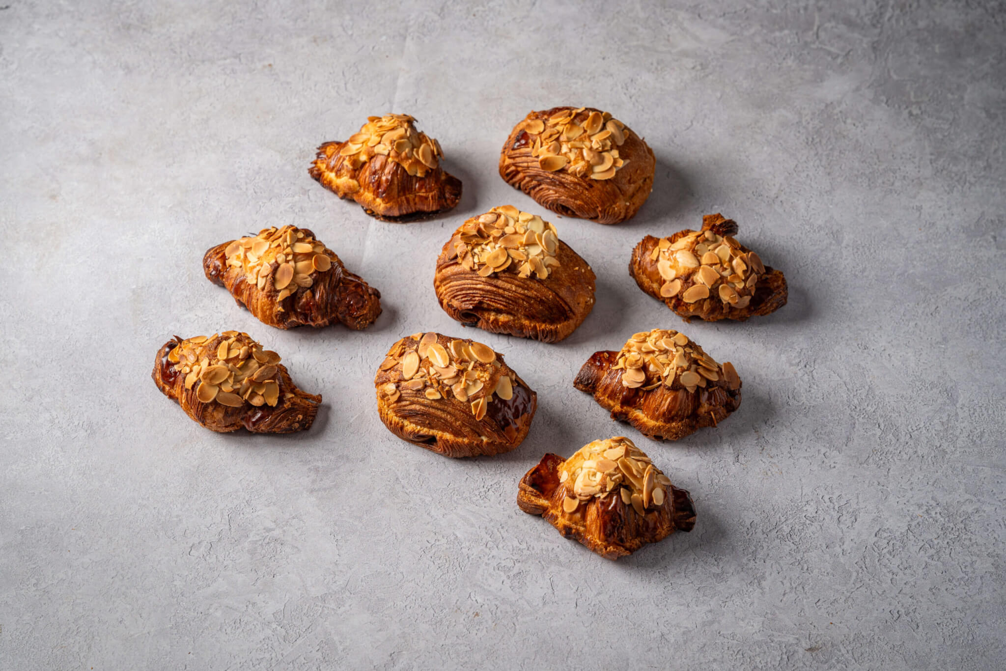קרואסוני חמאה במילוי קרם שקדים שמיוצר במקום, חלקם ממולאים שוקולד ולרונה, בציפוי שקדים פרוסים קלויים. כולל 12 יחידות.